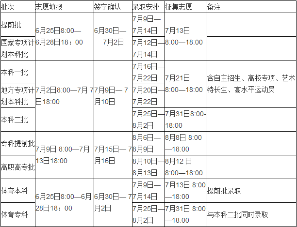 6月23日至27日:填报本科(含本科预科、高水平运动队、高水平艺术团、高校自主选拔、国家专项计划、高校专项计划、地方专项计划,不含独立学院和民办高校本科)志愿、艺术类本科专业(不含独立学院和民办高校艺术类本科专业)志愿、体育类本科专业(不含独立学院和民办高校体育类本科专业)志愿。