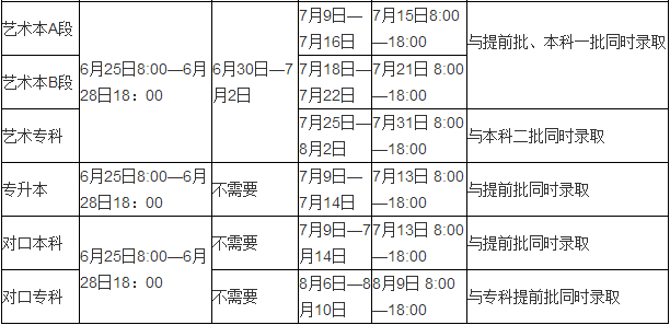 本科A批(含特殊类型招生、高校专项计划、地方农村专项计划、本省本科院校与高职院校联合办学的本科专业)及艺术类本科学校:7月6日8:00至8日17:30。